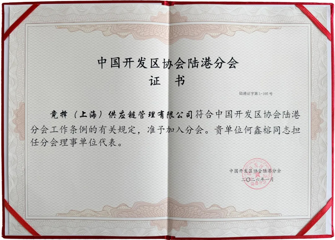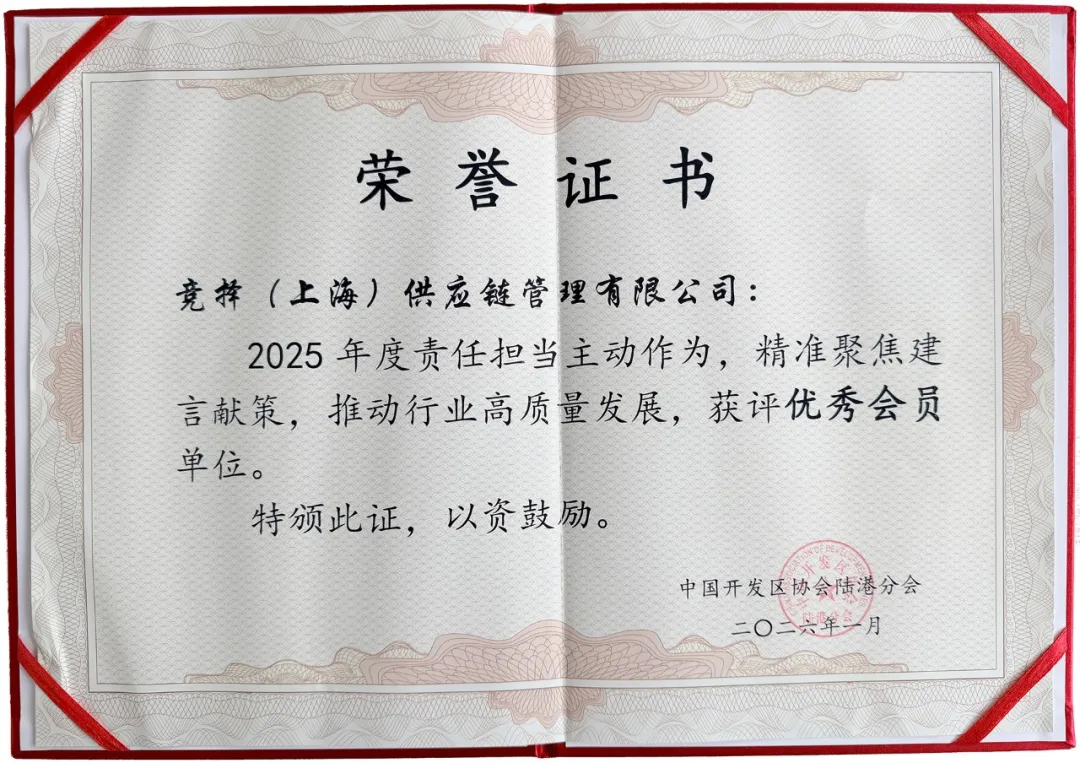 经过严格评选,竞择(上海)供应链管理有限公司正式成为中国开发区协会陆港分会理事单位,标志着公司在行业中的专业能力和影响力获得了业内的高度肯定。同时,公司也荣获“2025年度优秀会员单位”称号。这一双重荣誉不仅是对竞择供应链过去工作的认可,也为公司未来在陆港领域发挥更大作用奠定了基础。