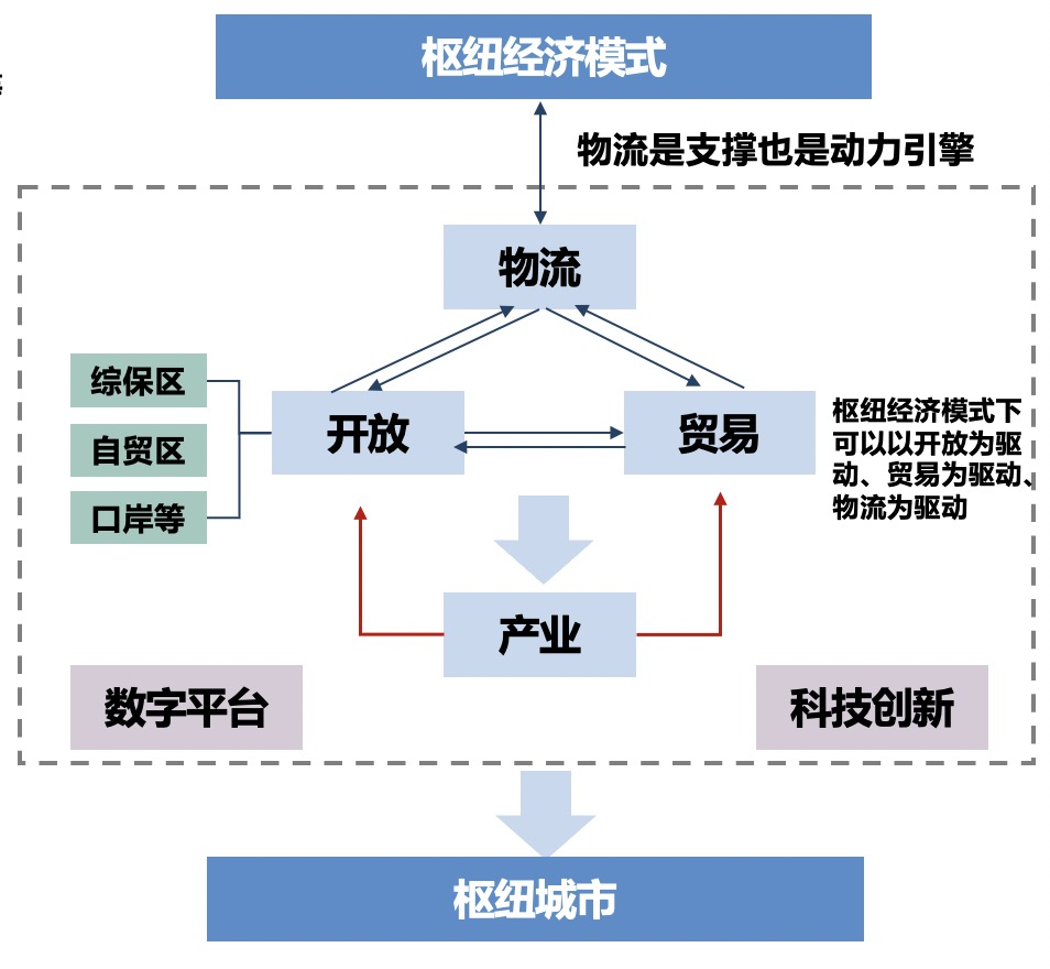 发展枢纽经济有三个关键,概括来讲是要抓住“一个突破口、一个核心、一个目标”。一个突破口是建设好物流枢纽,以此为平台,通过优化服务、降低成本,突破性的形成对货物、贸易的集聚性。一个核心是发展贸易及临港制造,当通道畅通、货物集聚后,要依托枢纽大力发展贸易、布局临港制造业,进一步强化全要素的配置能力,吸引人才、技术、资本集聚。一个目标是实现物流贸易产业的融合发展、实现物流枢纽到供应链枢纽的转变,即借助枢纽经济这一高质量高效率的经济发展模式,借助临港产业真正提升整个城市的产业能级,形成产业集群,提升在区域、国际的产业分工地位。